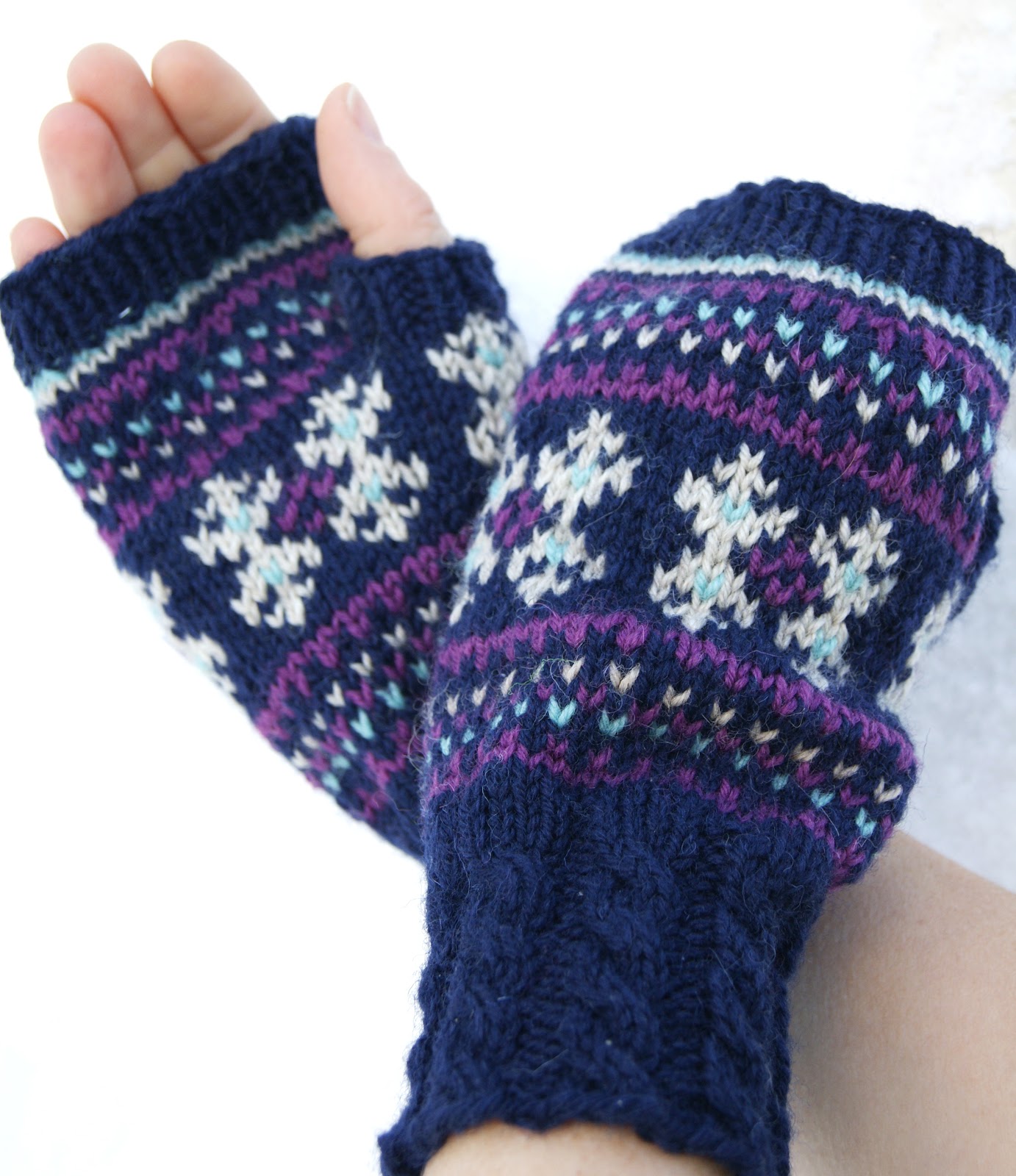 Dette blir et bidrag til månedens utfordring i Pinnekroken med tema "stemning." Om man kommer i direkte julestemning av disse skal være usagt, men man kan godt komme i vinterstemning. Snøen bak er kritthvit, og hvit snø bringer hvit jul! Pulsvarmerne er strikket i kjent stil i selvkomponert mønster.